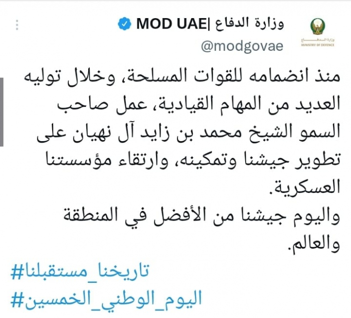 وأشار حساب الوزارة على موقع التدوين المصغر تويتر، اليوم إلى أنه: "منذ انضمامه للقوات المسلحة، وخلال توليه العديد من المهام القيادية، عمل صاحب السمو الشيخ محمد بن زايد آل نهيان على تطوير جيشنا وتمكينه، وارتقاء مؤسستنا العسكرية".