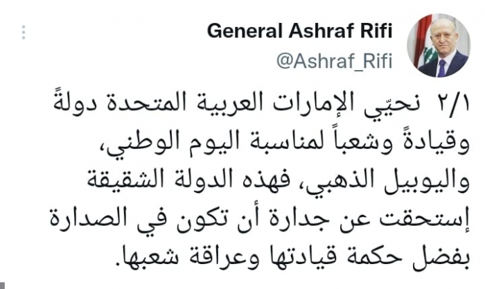 وقال في تغريدة على حسابه بموقع التدوين المصغر تويتر، اليوم إننا: "نحيّي الإمارات العربية المتحدة دولةً وقيادةً وشعباً لمناسبة اليوم الوطني، واليوبيل الذهبي".