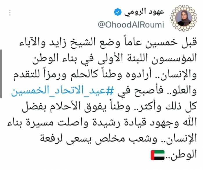 وكتبت في تغريدة على حسابها بموقع التدوين المصغر تويتر، اليوم أنه: "قبل خمسين عاماً وضع الشيخ زايد والآباء المؤسسون اللبنة الأولى في بناء الوطن والإنسان".