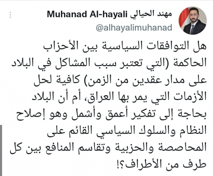 وتساءل في تغريدة على حسابه بموقع التدوين المصغر تويتر، اليوم أن: "هل التوافقات السياسية بين الأحزاب الحاكمة (التي تعتبر سبب المشاكل في البلاد على مدار عقدين من الزمن) كافية لحل الأزمات التي يمر بها العراق؟".
