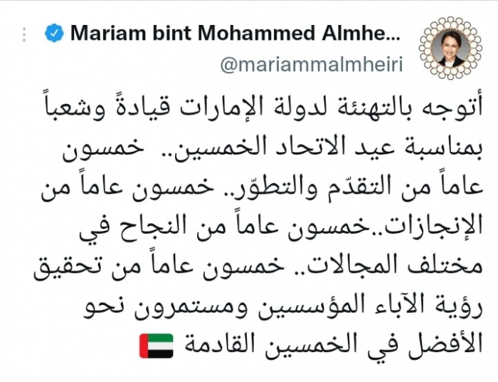 وقالت في تغريدة على حسابها بموقع التدوين المصغر تويتر، اليوم إني: "أتوجه بالتهنئة لدولة الإمارات قيادةً وشعباً بمناسبة عيد الاتحاد الخمسين".