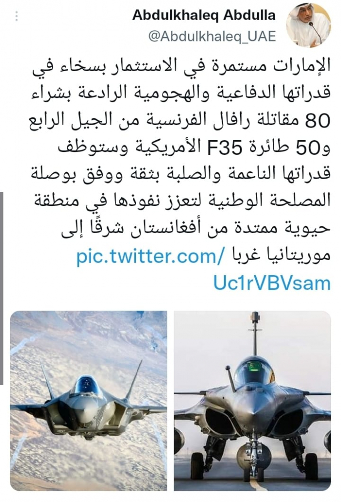 وأوضح في تغريدة على حسابه بموقع التدوين المصغر تويتر، اليوم أن: "الإمارات مستمرة في الاستثمار بسخاء في قدراتها الدفاعية والهجومية الرادعة بشراء 80 مقاتلة رافال الفرنسية من الجيل الرابع، و50 طائرة F35 الأمريكية".