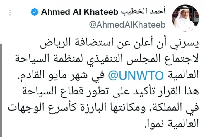 وكتب في تغريدة على حسابه بموقع التدوين المصغر تويتر، اليوم أنه: "يسرني أن أعلن عن استضافة الرياض لاجتماع المجلس التنفيذي لمنظمة السياحة العالمية في شهر مايو القادم".