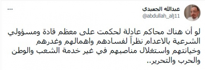 وأشار في تغريدة على حسابه بموقع التدوين المصغر تويتر، اليوم إلى أنه: "لو أن هناك محاكم عادلة لحكمت على معظم قادة ومسؤولي الشرعية بالإعدام نظرا لفسادهم وإهمالهم وغدرهم وخيانتهم واستغلال مناصبهم في غير خدمة الشعب والوطن والحرب والتحرير".