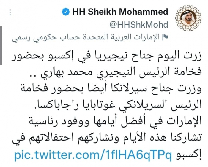 وأوضح في تغريدة على حسابه بموقع التدوين المصغر تويتر، اليوم أني: "زرت اليوم جناح نيجيريا في إكسبو بحضور فخامة الرئيس النيجيري محمد بهاري، وزرت جناح سيرلانكا أيضا بحضور فخامة الرئيس السريلانكي غوتابايا راجاباكسا".