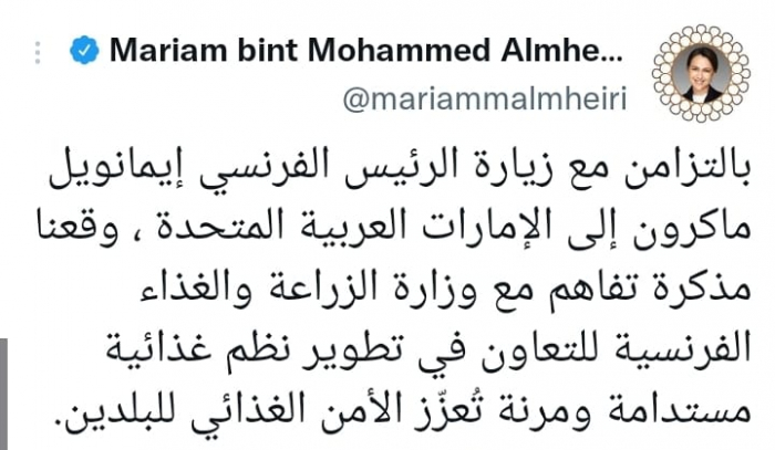 وكشفت في تغريدة على حسابها بموقع التدوين المصغر تويتر، اليوم أنه: "بالتزامن مع زيارة الرئيس الفرنسي إيمانويل ماكرون إلى الإمارات العربية المتحدة، وقعنا مذكرة تفاهم مع وزارة الزراعة والغذاء الفرنسية للتعاون في تطوير نظم غذائية مستدامة ومرنة تُعزّز الأمن الغذائي للبلدين".
