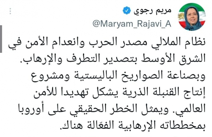 وشددت في تغريدة على حسابها بموقع التدوين المصغر تويتر، اليوم على أن: "نظام الملالي مصدر الحرب وانعدام الأمن في الشرق الأوسط بتصدير التطرف والإرهاب".