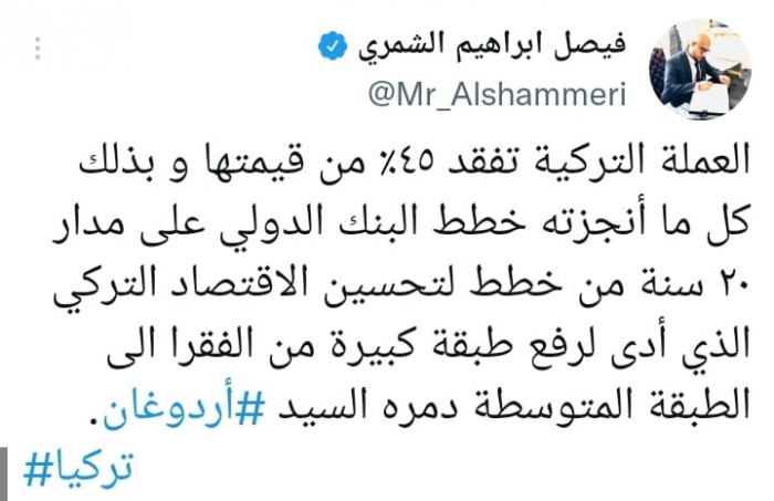 وأردفك "وبذلك كل ما أنجزته خطط البنك الدولي على مدار 20 سنة من خطط لتحسين الاقتصاد التركي الذي أدى لرفع طبقة كبيرة من الفقراء إلى الطبقة المتوسطة دمره السيد أردوغان".