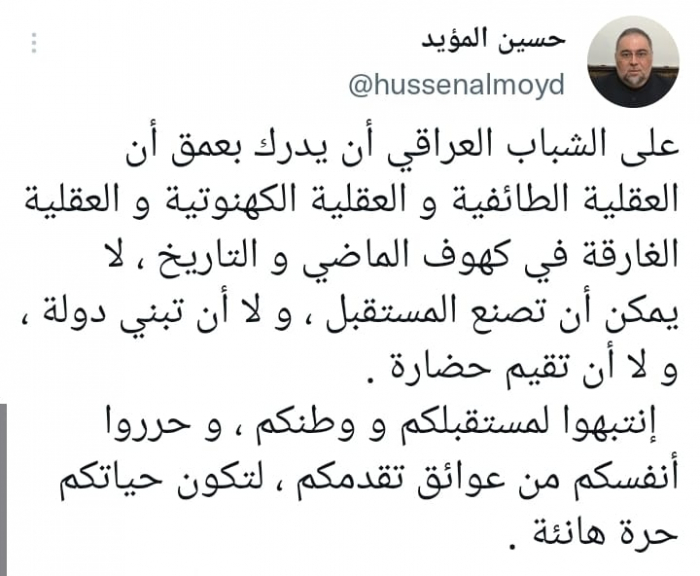 وكتب في تغريدة على حسابه بموقع التدوين المصغر تويتر، اليوم أنه: "على الشباب العراقي أن يدرك بعمق أن العقلية الطائفية والعقلية الكهنوتية والعقلية الغارقة في كهوف الماضي والتاريخ ، لا يمكن أن تصنع المستقبل، ولا أن تبني دولة، ولا أن تقيم حضارة".