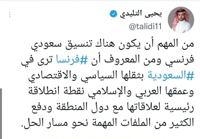واعتبر في تغريدة على حسابه بموقع التدوين المصغر تويتر، اليوم أنه: "من المهم أن يكون هناك تنسيق سعودي فرنسي".