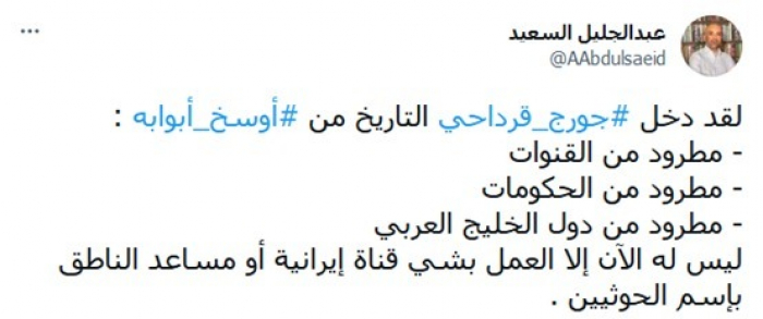 وكتب في تغريدة عبر "تويتر"، اليوم: "لقد دخل جورج قرداحي التاريخ من.... أبوابه: