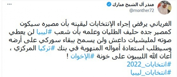 كشف المدون السعودي منذر آل الشيخ مبارك، أسباب رفض مفتي جماعة الإخوان الإرهابية بليبيا المدعو الصادق الغرياني، لإجراء الانتخابات.