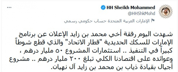 وكتب محمد بن راشد في تغريدة عبر "تويتر": "شهدت اليوم رفقة أخي محمد بن زايد الإعلان عن برنامج الإمارات للسكك الحديدية "قطار الاتحاد" والذي قطع شوطاً كبيراً في التنفيذ".