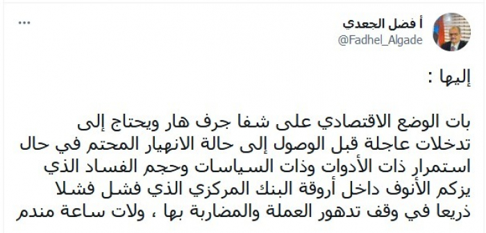 وكشف في تغريدة عبر "تويتر"، اليوم: "بات الوضع الاقتصادي على شفا جرف هار ويحتاج إلى تدخلات عاجلة قبل الوصول إلى حالة الانهيار المحتم".