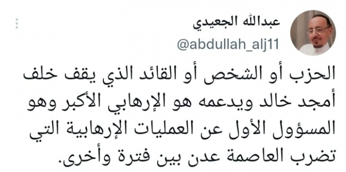 اعتبر الشاعر عبدالله الجعيدي، أن داعمي القيادي الإخواني الإرهابي المدعو أمجد خالد من قيادات الشرعية الإخوانية إرهابيين لدوره في الجرائم المروعة بالجنوب.