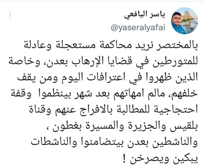 وأوضح في تغريدة على حسابه بموقع التدوين المصغر تويتر، اليوم على أنه: "بالمختصر نريد محاكمة مستعجلة وعادلة للمتورطين في قضايا الإرهاب بعدن، وخاصة الذين ظهروا في اعترافات اليوم ومن يقف خلفهم".