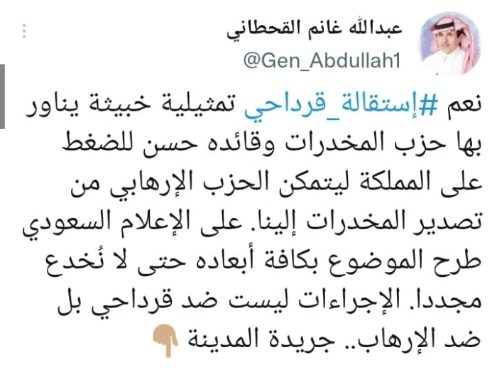 وكشف في تغريدة على حسابه بموقع التدوين المصغر تويتر، اليوم أن: "استقالة قرداحي تمثيلية خبيثة يناور بها حزب المخدرات وقائده حسن للضغط على المملكة ليتمكن الحزب الإرهابي من تصدير المخدرات إلينا".