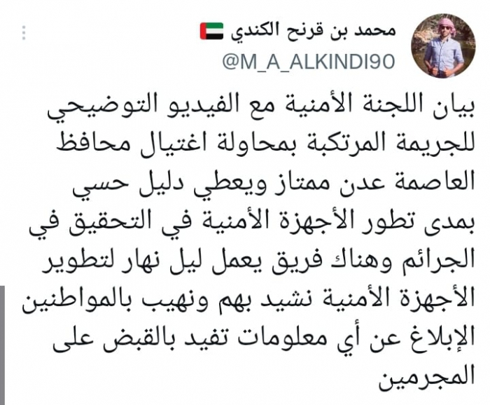 ورأى في تغريدة على حسابه بموقع التدوين المصغر تويتر، اليوم أن: "بيان اللجنة الأمنية مع الفيديو التوضيحي للجريمة المرتكبة بمحاولة اغتيال محافظ العاصمة عدن ممتاز".