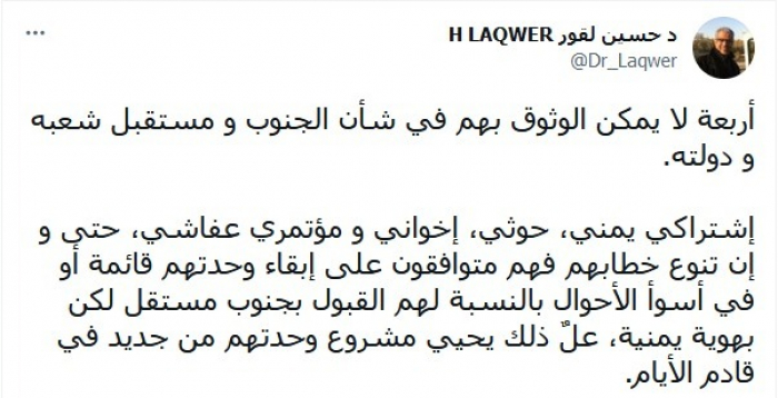 وذكر في تغريدة عبر "تويتر"، هذه الفئات: "اشتراكي يمني، حوثي، إخواني، مؤتمري عفاشي، حتى وإن تنوع خطابهم فهم متوافقون على إبقاء وحدتهم قائمة أو في أسوأ الأحوال بالنسبة لهم القبول بجنوب مستقل لكن بهوية يمنية، علٌ ذلك يحيي مشروع وحدتهم من جديد في قادم الأيام".