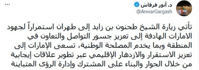 وأوضح في تغريدة عبر "تويتر"، اليوم: "تأتي زيارة الشيخ طحنون بن زايد إلى طهران استمرارا لجهود الإمارات الهادفة إلى تعزيز جسور التواصل والتعاون في المنطقة وبما يخدم المصلحة الوطنية".