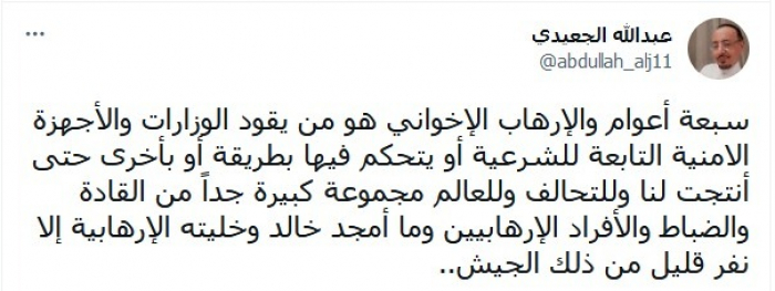 وكشف في تغريدة عبر "تويتر"، اليوم: "سبعة أعوام والإرهاب الإخواني هو من يقود الوزارات والأجهزة الأمنية التابعة للشرعية أو يتحكم فيها بطريقة أو بأخرى".