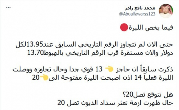 كشف المحلل السعودي محمد نافع رامز، عن الحالة التي تصل خلالها الليرة التركية إلى 20 أمام الدولار، مشيرا إلى أنها تشهد استقرار قرب الرقم التاريخي بالهبوط 13.70.