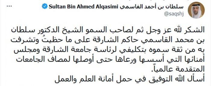 وكتب في تغريدة عبر "تويتر"، اليوم: "الشكر لله عز وجل ثم لصاحب السمو الشيخ الدكتور سلطان بن محمد القاسمي حاكم الشارقة على ما حظيتُ وتشرفت به من ثقة سموه بتكليفي لرئاسة جامعة الشارقة ومجلس أمنائها التي أسسها ورعاها حتى أوصلها لمصاف الجامعات المتقدمة عالميا".