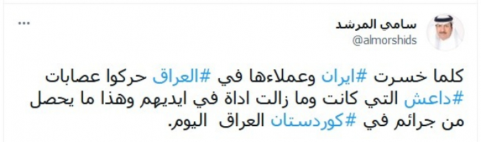 وأوضح في تغريدة عبر "تويتر"، اليوم: "كلما خسرت إيران وعملاءها في العراق حركوا عصابات داعش التي كانت وما زالت أداة في أيديهم، وهذا ما يحصل من جرائم في كردستان العراق اليوم".