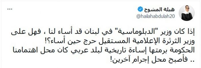 وأشارت في تغريدة عبر "تويتر"، اليوم، إلى وزير الخارجية اللبناني المدعو عبدالله بوحبيب: "إذا كان وزير الدبلوماسية في لبنان قد أساء لنا"، متسائلة: "هل على وزير الثرثرة الإعلامية المستقيل حرج حين أساء؟"، متحدثة عن المدعو جورج قرداحي.
