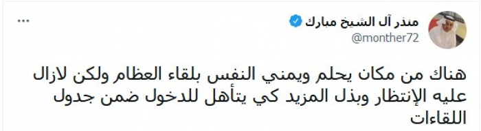 وكتب في تغريدة عبر "تويتر"، اليوم: "هناك من كان يحلم ويمني النفس بلقاء العظام، ولكن لا زال عليه الانتظار وبذل المزيد كي يتأهل للدخول ضمن جدول اللقاءات".