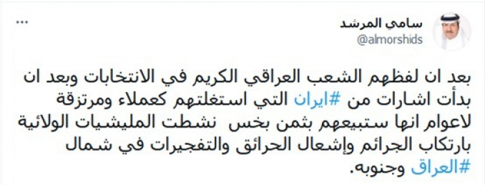 استنكر المحلل السياسي السعودي سامي المرشد، جرائم المليشيات بحق الشعب العراقي، بعدما نشطت التفجيرات في شمال وجنوب العراق، تزامنا مع خسارتها الانتخابات.