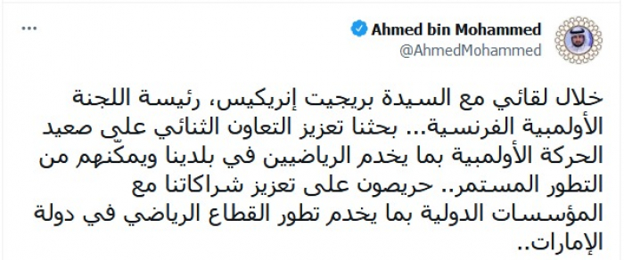 التقى الشيخ أحمد بن محمد بن راشد آل مكتوم، رئيس اللجنة الأولمبية الوطنية بدولة الإمارات العربية المتحدة، اليوم، بريجيت إنريكيس، رئيسة اللجنة الأولمبية الفرنسية.