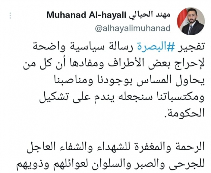 وكتب في تغريدة على حسابه بموقع التدوين المصغر تويتر، اليوم أن: "تفجير البصرة رسالة سياسية واضحة لإحراج بعض الأطراف ومفادها أن كل من يحاول المساس بوجودنا ومناصبنا ومكتسباتنا سنجعله يندم على تشكيل الحكومة".