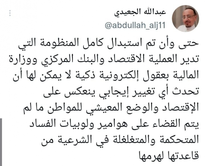 وقال في تغريدة على حسابه بموقع التدوين المصغر تويتر اليوم إنه: "حتى وأن تم استبدال كامل المنظومة التي تدير العملية الاقتصادية والبنك المركزي ووزارة المالية بعقول إلكترونية ذكية".