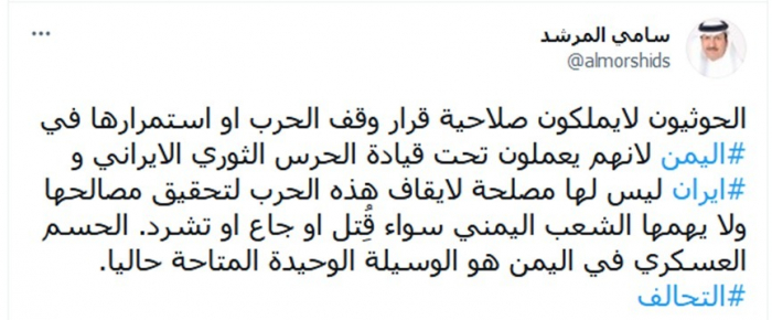 وشدد على أن الحسم العسكري في اليمن هو الوسيلة الوحيدة المتاحة حاليا، مختتما تغريدته بهاشتاج: "التحالف".