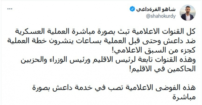 انتقد الكاتب الصحفي العراقي شاهو القرة داغي، طريقة تناول الإعلام العراقي للعملية العسكرية ضد تنظيم داعش الإرهابي في إقليم كردستان، بعد إعلان الخطط العسكرية سعيا وراء السبق.