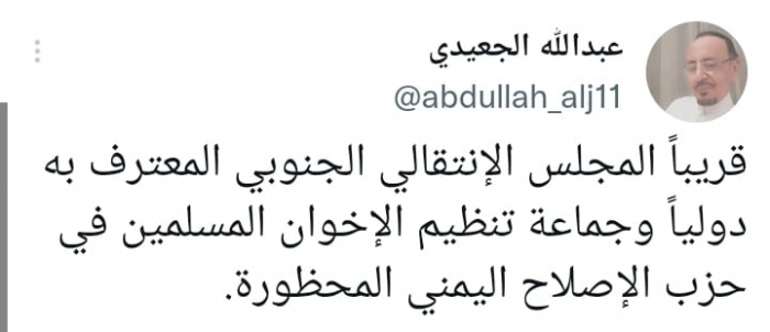 وتوقع في تغريدة على حسابه بموقع التدوين المصغر تويتر اليوم، قائلا: "قريبا المجلس الانتقالي الجنوبي المعترف به دوليا وجماعة تنظيم الإخوان المسلمين في حزب الإصلاح اليمني المحظورة".