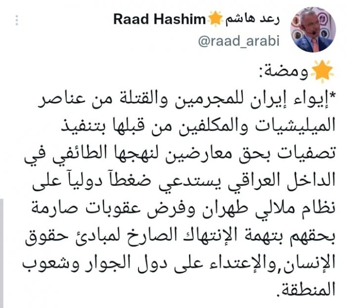 وقال في تغريدة على حسابه بموقع التدوين المصغر تويتر اليوم إن: "إيواء إيران للمجرمين والقتلة من عناصر الميليشيات والمكلفين من قبلها بتنفيذ تصفيات بحق معارضين لنهجها الطائفي في الداخل العراقي يستدعي ضغطآ دوليآ على نظام ملالي طهران".