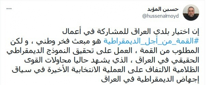 وأوضح في تغريدة عبر "تويتر"، اليوم: "اختيار بلدي العراق للمشاركة في أعمال القمة من أجل الديمقراطية هو مبعث فخر وطني".