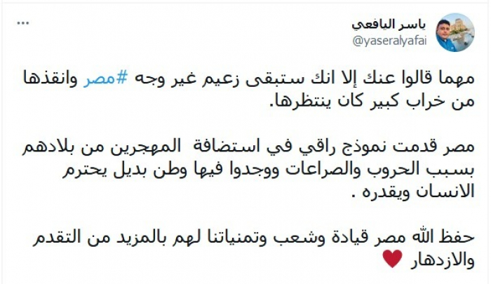 أشاد الكاتب الصحفي ياسر اليافعي، بجهود الرئيس عبدالفتاح السيسي، في التغيير الذي شهدته مصر، مشيرا إلى أنها قدمت نموذجا راقيا في استضافة المهجرين من بلادهم.