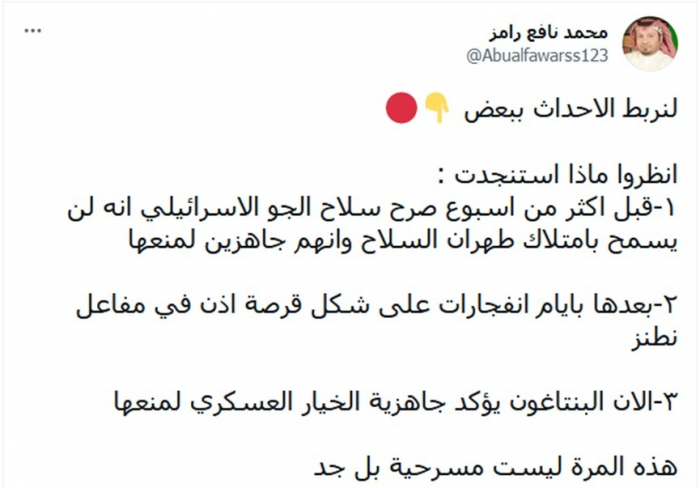 1- قبل أكثر من أسبوع صرح سلاح الجو الإسرائيلي بأنه لن يسمح بامتلاك طهران السلاح وأنهم جاهزين لمنعها.