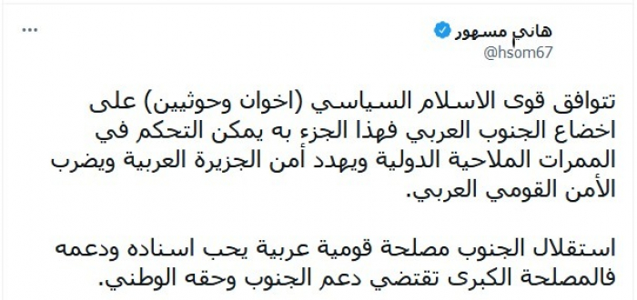 شدد الكاتب الصحفي هاني مسهور، على ضرورة استقلال الجنوب العربي، كونه يمثل مصلحة قومية عربية، لقطع الطريق على قوى الشر في تحقيق مخططاتهم الخبيثة.