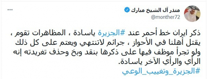 وأوضح في تغريدة عبر "تويتر"، اليوم: "ذكر إيران خط أحمر عند الجزيرة يا سادة، المظاهرات تقوم، يقتل أهلنا في الأحواز، جرائم لا تنتهي ويعتم على كل ذلك".