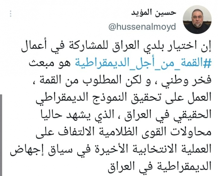 شدد الناشط السياسي حسين المؤيد على ضرورة معالجة "القمة من أجل الديمقراطية"، أزمات التطرف والأصولية الدينية.