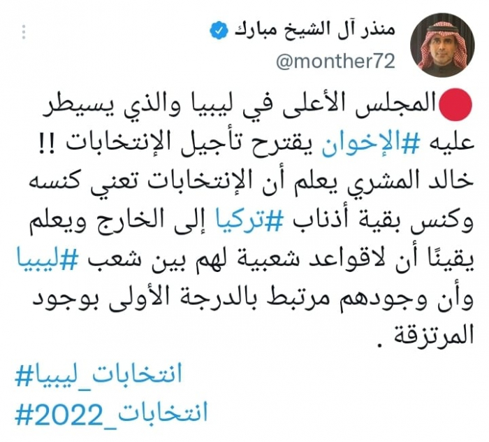 وأضاف أن: "خالد المشري يعلم أن الانتخابات تعني كنسه وكنس بقية أذناب تركيا إلى الخارج ويعلم يقينًا أن لا قواعد شعبية لهم بين شعب ليبيا وأن وجودهم مرتبط بالدرجة الأولى بوجود المرتزقة"، مختتما بهاشتاج: "انتخابات ليبيا، وانتخابات 2022".