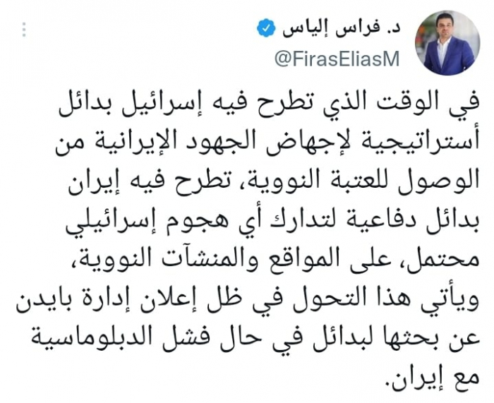 أوضح في تغريدة على حسابه بموقع التدوين المصغر تويتر، اليوم أنه: "في الوقت الذي تطرح فيه إسرائيل بدائل استراتيجية لإجهاض الجهود الإيرانية من الوصول للعتبة النووية، تطرح فيه إيران بدائل دفاعية لتدارك أي هجوم إسرائيلي محتمل، على المواقع والمنشآت النووية".