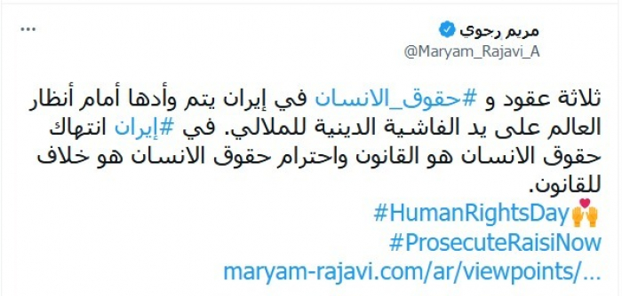 جاء ذلك في تغريدة عبر "تويتر"، اليوم، قائلة: "ثلاثة عقود وحقوق الإنسان في إيران يتم وأدها أمام أنظار العالم على يد الفاشية الدينية للملالي".