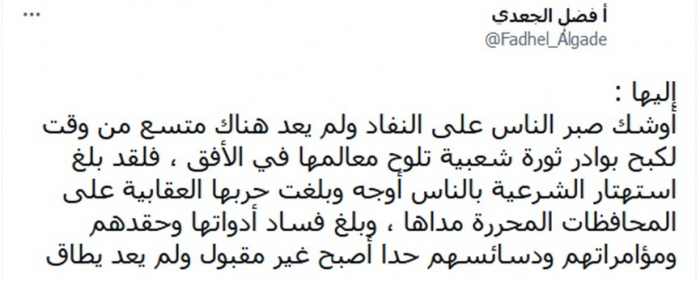 وأكد أن هناك "بوادر ثورة شعبية تلوح معالمها في الأفق بعدما أوشك صبر الناس على النفاد، ولم يعد هناك متسع من وقت لكبحها".