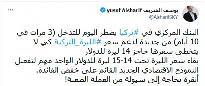 وأوضح في تغريدة عبر "تويتر"، اليوم، أن: "البنك المركزي في تركيا يضطر اليوم للتدخل (3 مرات في 10 أيام) من جديد لدعم سعر الليرة التركية، كي لا يتخطى سعرها حاجز 14 ليرة للدولار".