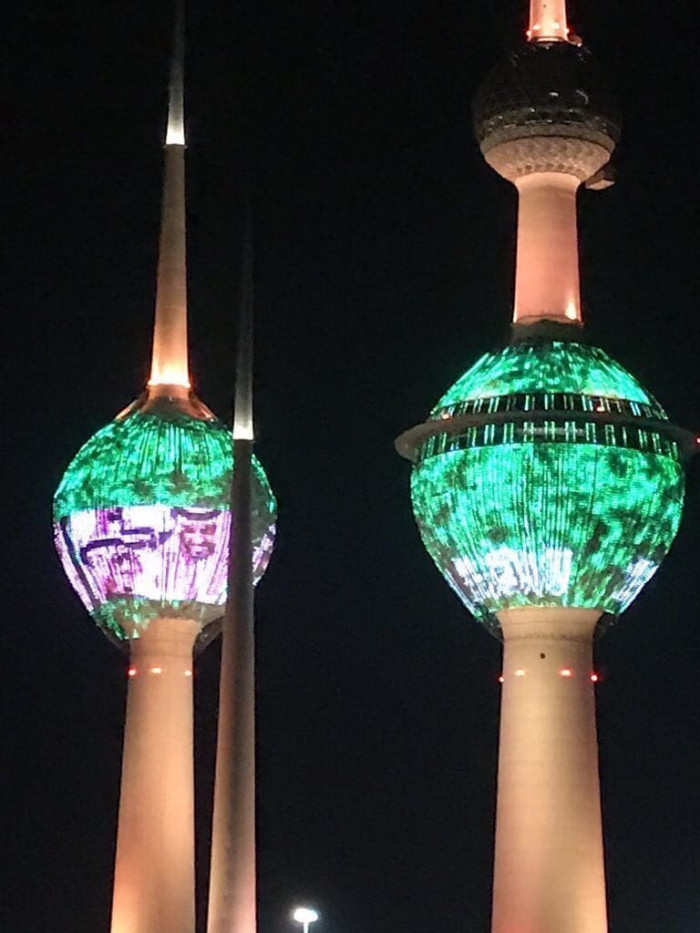تزينت أبراج الكويت بألوان العلم السعودي الخضراء وصورة ولي العهد السعودي الأمير محمد بن سلمان.